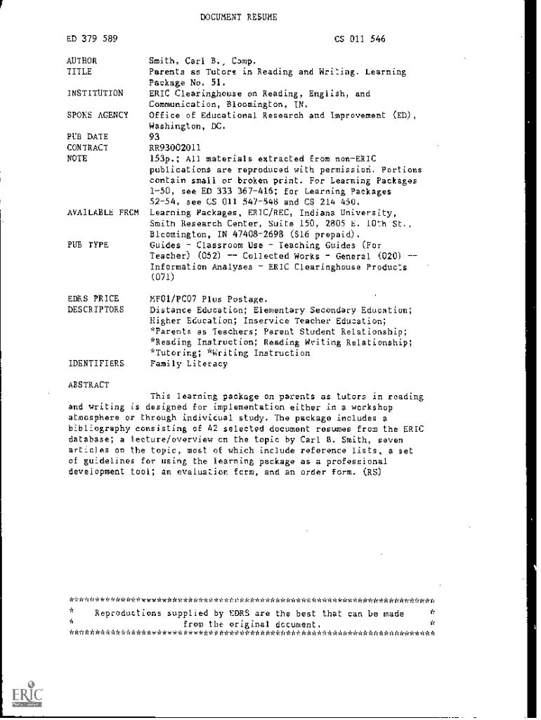 DOCUMENT RESUME ED 379 589AUTHOR TITLE INSTITUTIONSPONS AGENCY PUB DATE CONTRACT NOTEAVAILABLE FROM TYPES 011 546Smith, Carl B., Comp. Parents as Tutors in Reading and Writing. Learning Package No.