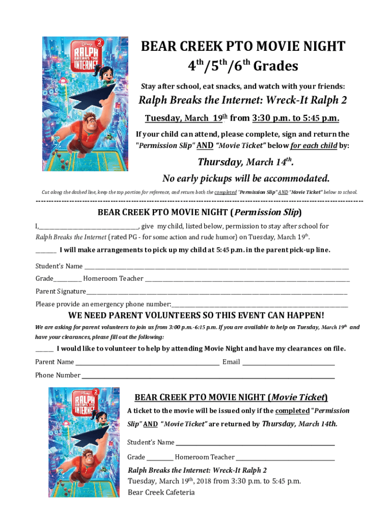 BEAR CREEK PTO MOVIE NIGHT 4th/5th/6th Grades Stay after school, eat snacks, and watch with your friends:Ralph Breaks the Internet: Wreck It Ralph 2 Tuesday, March 19th from 3:30 p.m. to 5:45 p.m.