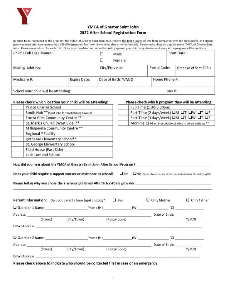 YMCA of Greater Saint John 2022 After School Registration Form In order to be registered in the program, the YMCA of Greater Saint John must receive the first 4 pages of this form completed with the