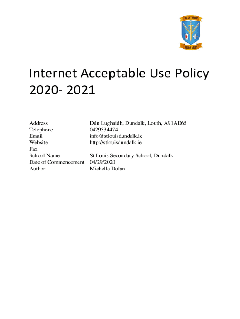 Internet Acceptable Use Policy 2020 2021 Address Telephone Email Website Fax School Name Date of Commencement Author Defied, Dundalk, South, A91AE65 0429334474 info@stlouisdundalk.ie http://stlouisdundalk.ie