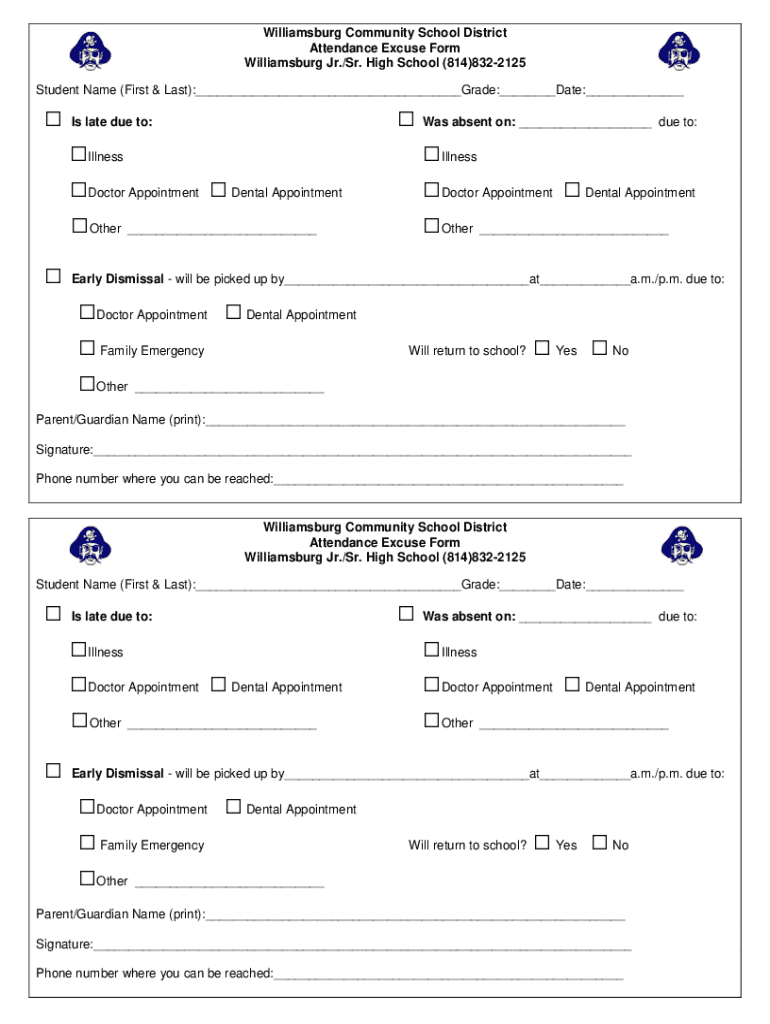 Williamsburg Community School District Attendance Excuse Form Williamsburg Jr./Sr. High School (814)8322125 Student Name (First & Last):___Grade:___Date:___ Is late due to: Illness Doctor Appointment