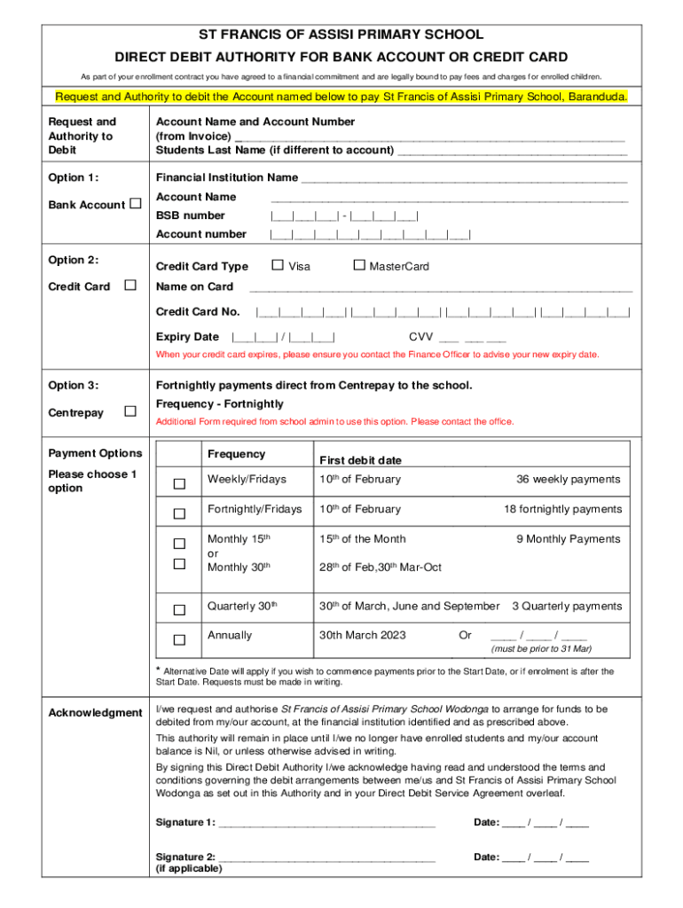 ST FRANCIS OF ASSISI PRIMARY SCHOOL DIRECT DEBIT AUTHORITY FOR BANK ACCOUNT OR CREDIT CARD As part of your enrollment contract you have agreed to a financial commitment and are legally bound to pay