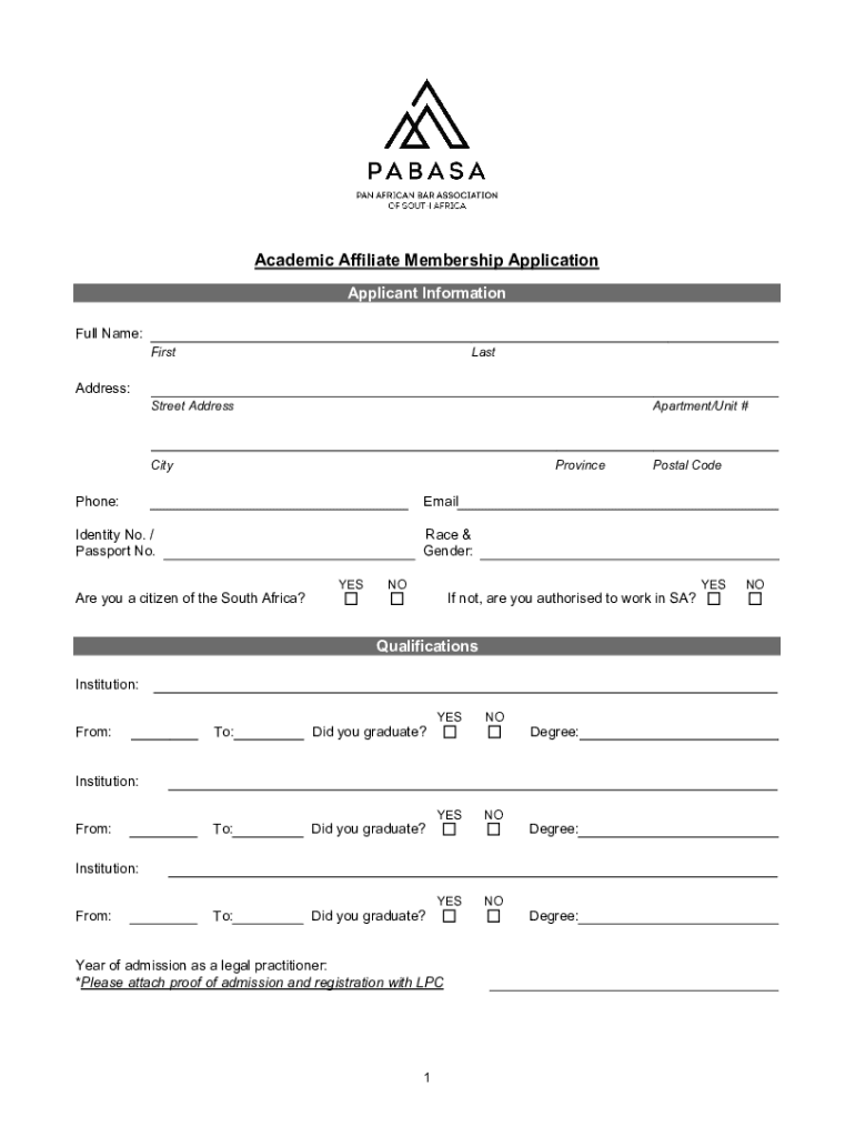 Academic Affiliate Membership Application Applicant Information Full Name: Address:FirstLastStreet AddressApartment/Unit #CityProvincePhone:EmailIdentity No. / Passport No. Race & Gender:Are you a