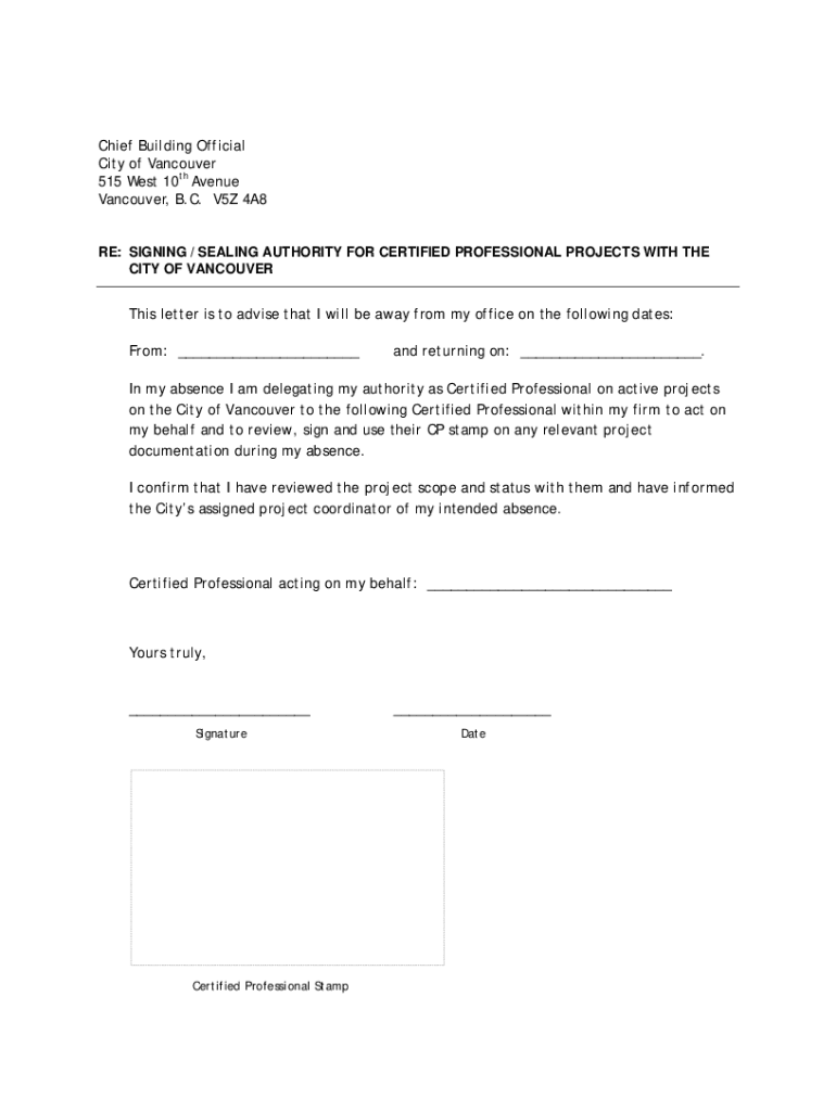 Chief Building Official City of Vancouver 515 West 10th Avenue Vancouver, B.C. V5Z 4A8RE: SIGNING / SEALING AUTHORITY FOR CERTIFIED PROFESSIONAL PROJECTS WITH THE CITY OF VANCOUVERThis letter is to
