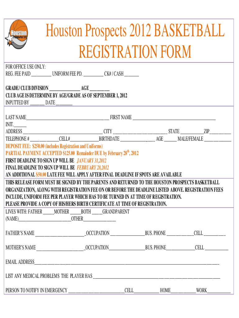 Houston Prospects 2012 BASKETBALL REGISTRATION FORM FOR OFFICE USE ONLY: REG. FEE PAID ___ UNIFORM FEE PD. ___ CK# / CASH ___ GRADE/ CLUB DIVISION ___ AGE ___ CLUB AGE IS Determines BY AGE/GRADE AS