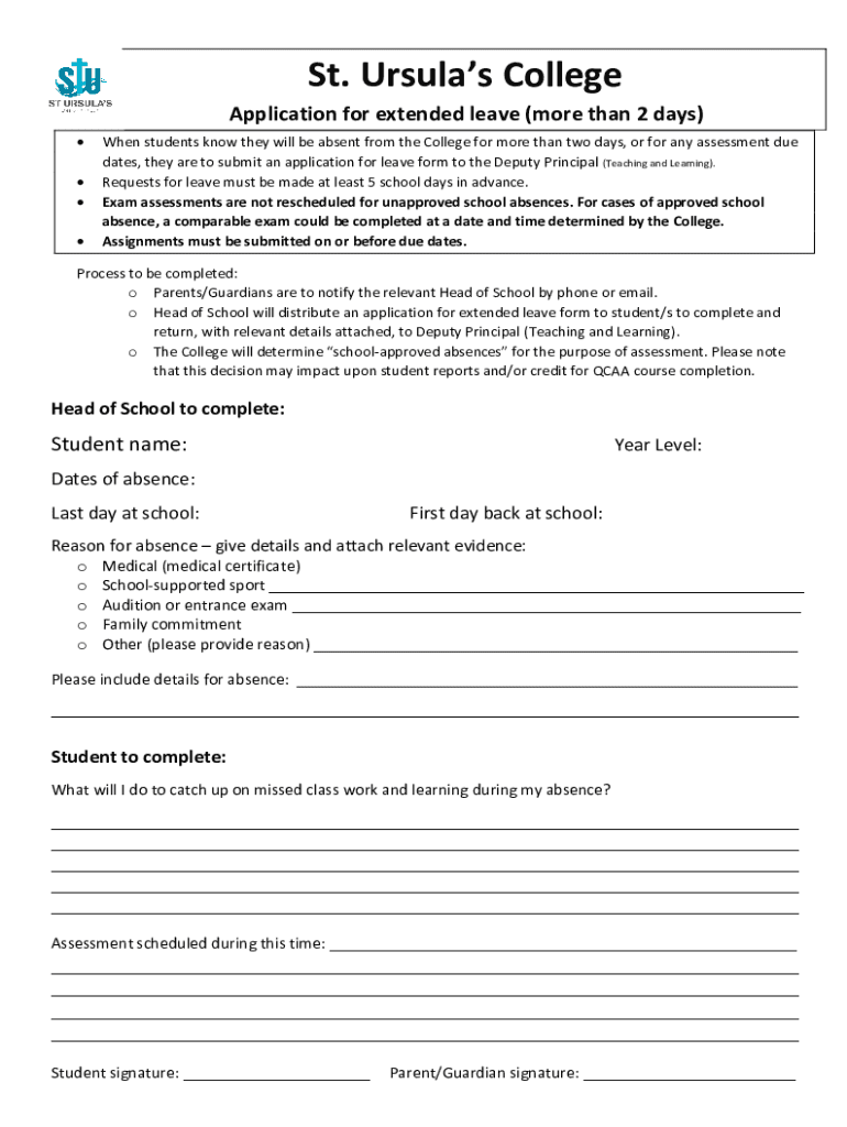 St. Ursula's CollegeApplication for extended leave (more than 2 days) When students know they will be absent from the College for more than two days, or for any assessment due dates, they are to submit