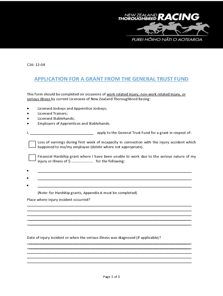 C16: 1204APPLICATION FOR A GRANT FROM THE GENERAL TRUST FUND This form should be completed on occasions of work related injury, nonwork related injury, or serious illness by current Licensees of New