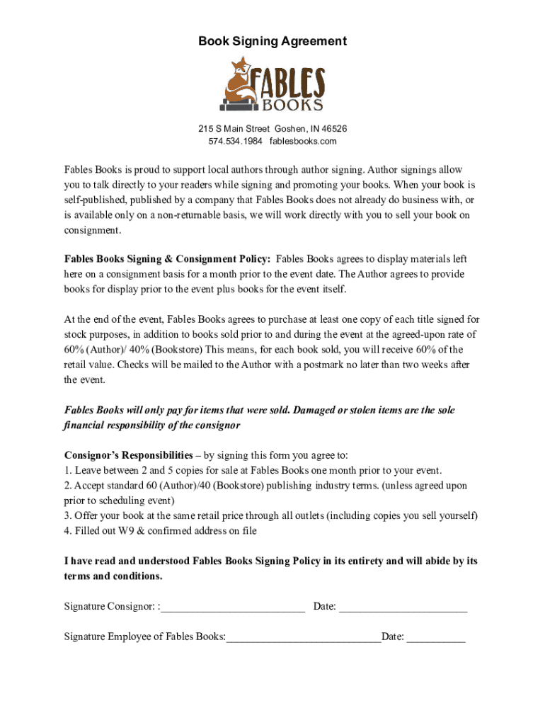 Book Signing Agreement215 S Main Street Goshen, IN 46526