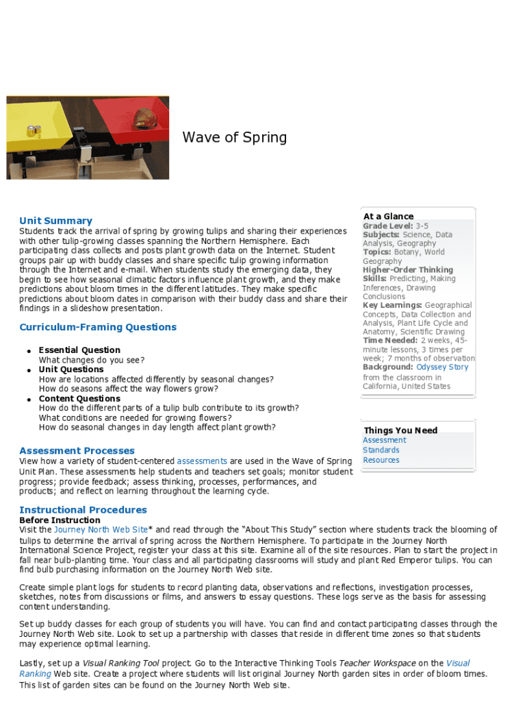 Wave of Stringent Summary Students track the arrival of spring by growing tulips and sharing their experiences with other tulip growing classes spanning the Northern Hemisphere. Each participating