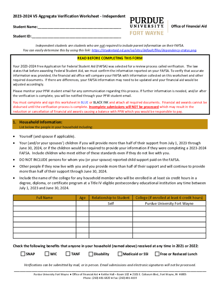20232024 V5 Aggregate Verification Worksheet Independent Student Name:___ Student ID: ___ Independent students are students who are not required to include parent information on their FAFSA. You can