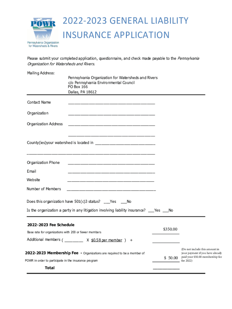 20222023 GENERAL LIABILITY INSURANCE APPLICATION Please submit your completed application, questionnaire, and check made payable to the PennsylvaniaOrganization for Watersheds and Rivers. Mailing
