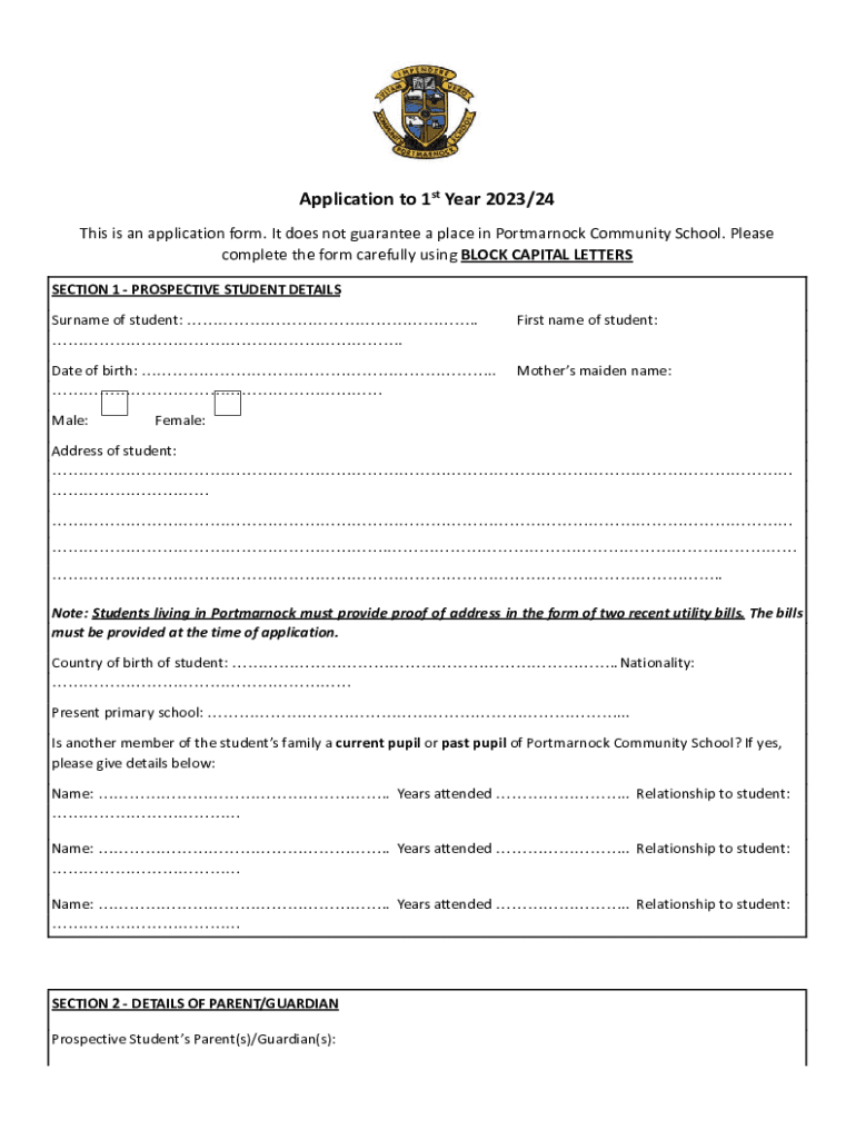 Application to 1st Year 2023/24 This is an application form. It does not guarantee a place in Portmarnock Community School. Please complete the form carefully using BLOCK CAPITAL LETTERS SECTION 1