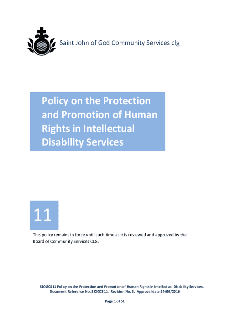 Saint John of God Community Services policy on the Protection and Promotion of Human Rights in Intellectual Disability Services11 This policy remains in force until such time as it is reviewed and