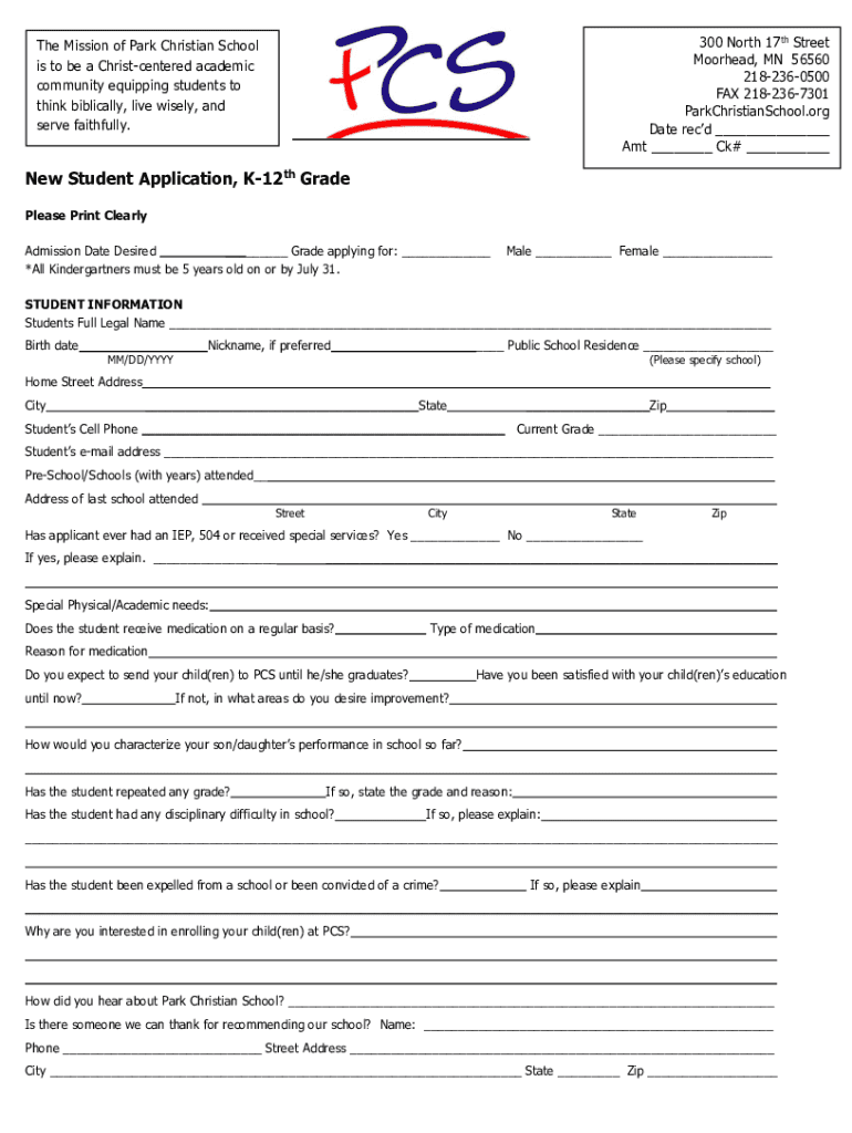300 North 17th Street Muirhead, MN 56560 2182360500 FAX 2182367301 ParkChristianSchool.org Date recd ___ Amt ___ Ck# ___The Mission of Park Christian School is to be a Christ centered academic community
