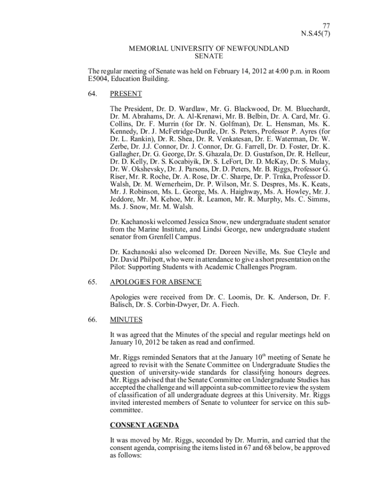 77 N.S.45(7) MEMORIAL UNIVERSITY OF NEWFOUNDLAND SENATE The regular meeting of Senate was held on February 14, 2012, at 4:00 p.m. in Room E5004, Education Building. 64.PRESENT The President, Dr. D.
