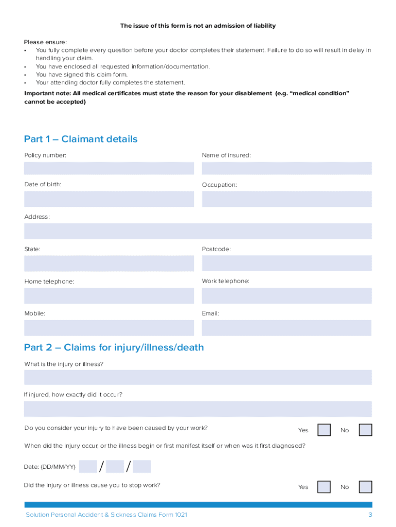 Individual Personal Accident & Sickness Claim Resolution Underwriting Agency Pty Ltd Level 5, 289 Flinders Lane, Melbourne VIC 3000 Australia Tel: 03 9654 6100Suite 2.03, Level 2, 65 York Street,