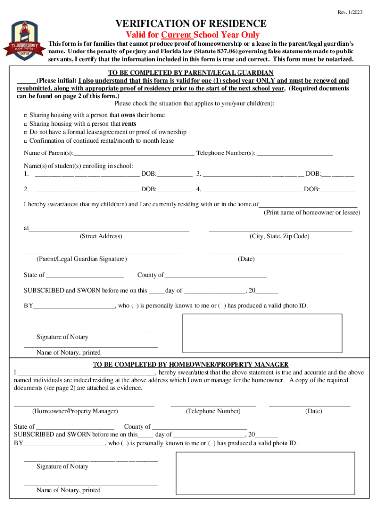 Rev. 1/2023VERIFICATION OF RESIDENCE Valid for Current School Year Only This form is for families that cannot produce proof of homeownership or a lease in the parent/legal guardians name. Under the