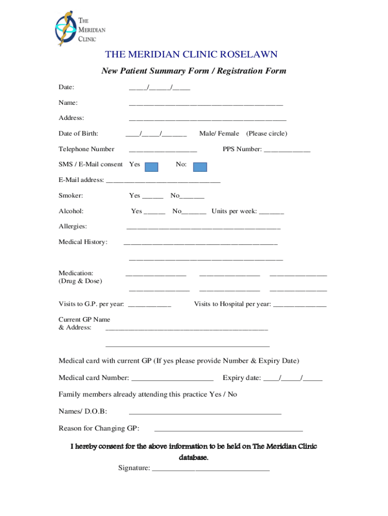 THE MERIDIAN CLINIC ROSE LAWN New Patient Summary Form / Registration Form Date:___/___/___Name:___Address:___Date of Birth:___/___/___Telephone Number Male/ Female___SMS / Email consent Yes(Please