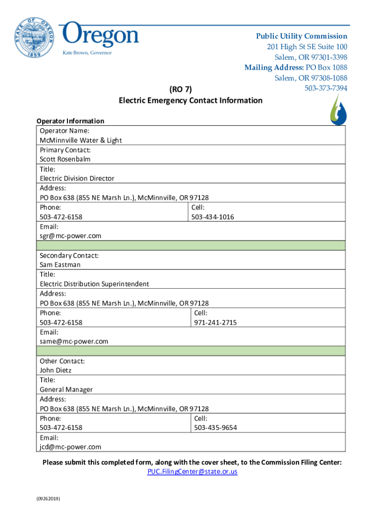 Public Utility Commission 201 High St SE Suite 100 Salem, OR 973013398 Mailing Address: PO Box 1088 Salem, OR 973081088 5033737394(RO 7) Electric Emergency Contact Information Operator Name: McMinnville