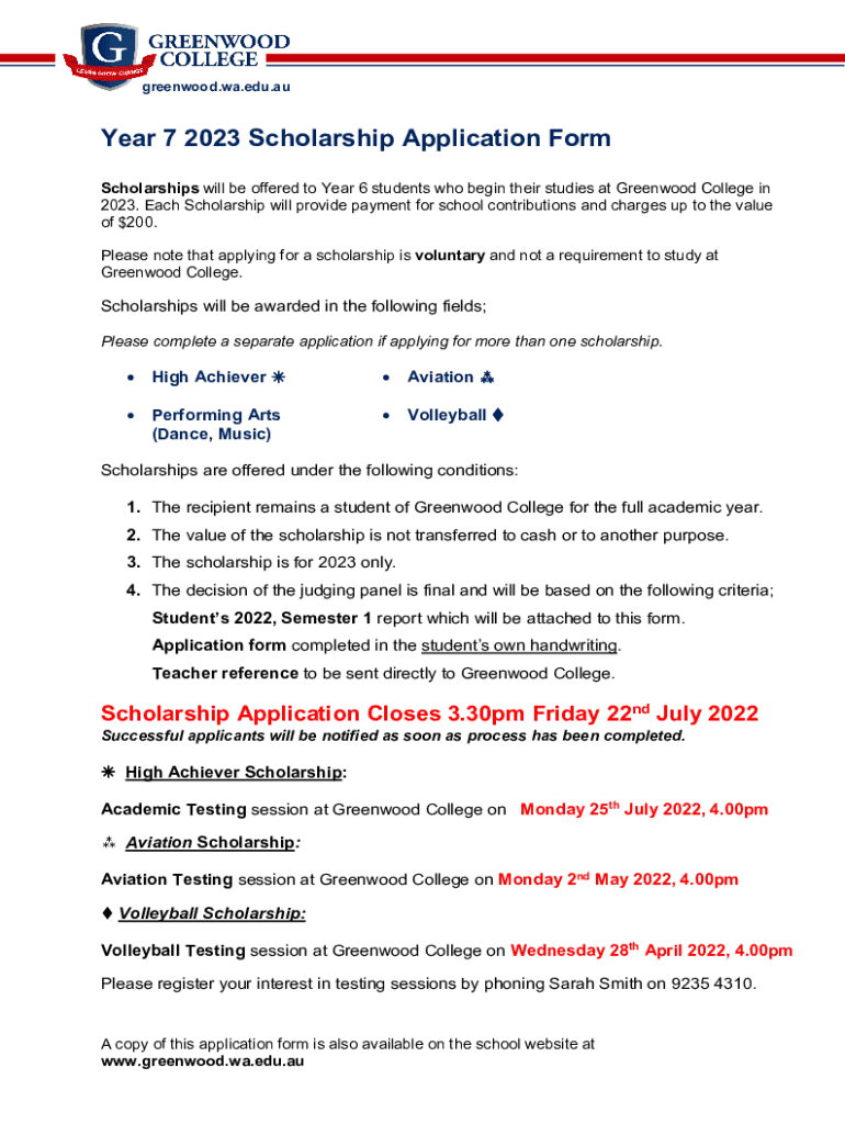 Greenwood.Wei.edu.year 7 2023 Scholarship Application Form Scholarships will be offered to Year 6 students who begin their studies at Greenwood College in 2023. Each Scholarship will provide payment