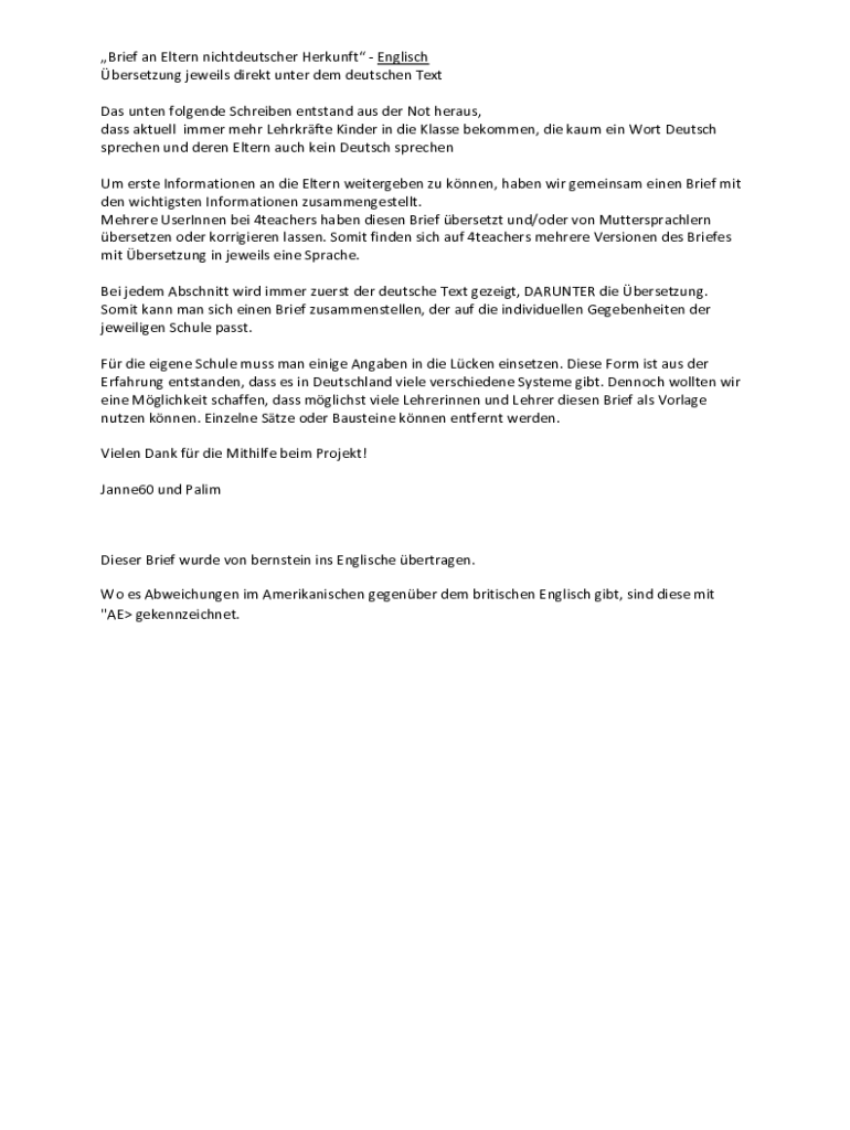 BriefanElternnichtdeutscherHerkunftEnglisch bersetzungjeweilsdirektunterdemdeutschenText DasuntenfolgendeSchreibenentstandausderNotheraus, dassaktuellimmermehrLehrkrfteKinderindieKlassebekommen, diekaumeinWortDeutsch