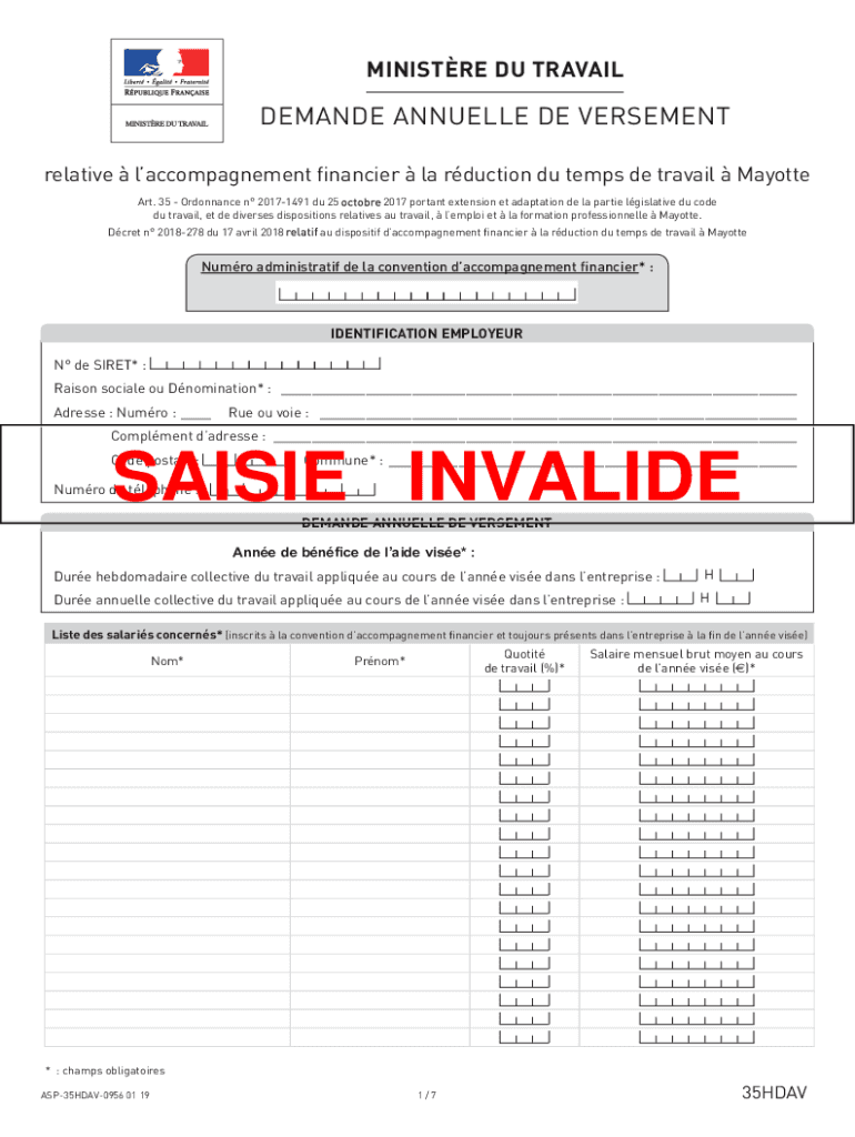 MINISTRY DU TRAVAILDEMANDE ANNUALLY DE VEHEMENT relative accompaniment financier la reduction Du temps DE travail Mayotte Art. 35 Ordinance n 20171491 Du 25 2017 portent extension ET adaptation DE