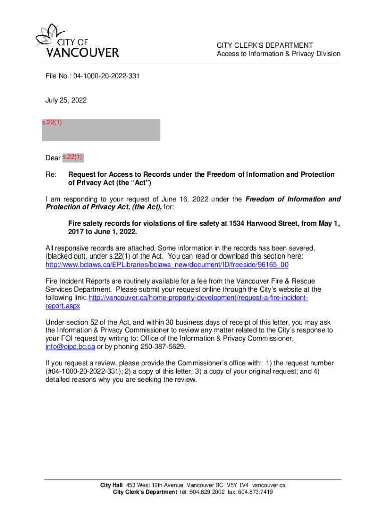 CITY OFVANCOUVERCITY CLERK\'S DEPARTMENT Access to Information & Privacy Divisional No.: 041000202022331July 25, 2022 s.22(1)Dear s.22(1) Re:Request for Access to Records under the Freedom of Information