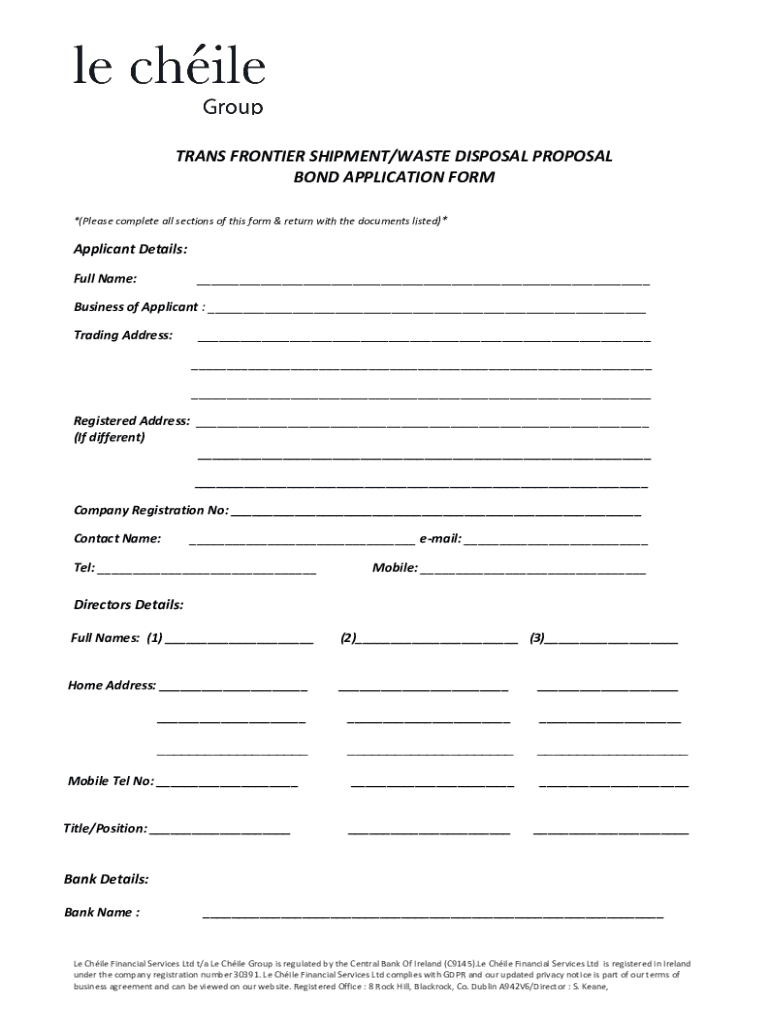 TRANS FRONTIER SHIPMENT/WASTE DISPOSAL PROPOSAL BOND APPLICATION FORM *(Please complete all sections of this form & return with the documents listed)*Applicant Details: Full Name:___Business of Applicant