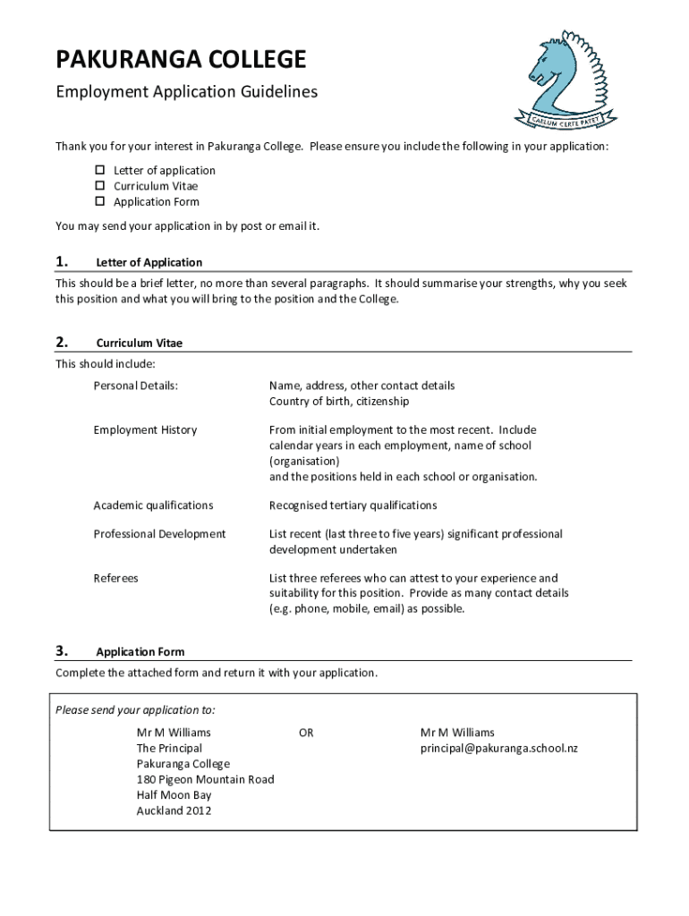 TAURANGA COLLEGE Employment Application Guidelines Thank you for your interest in Tauranga College. Please ensure you include the following in your application: Letter of application Curriculum Vitae