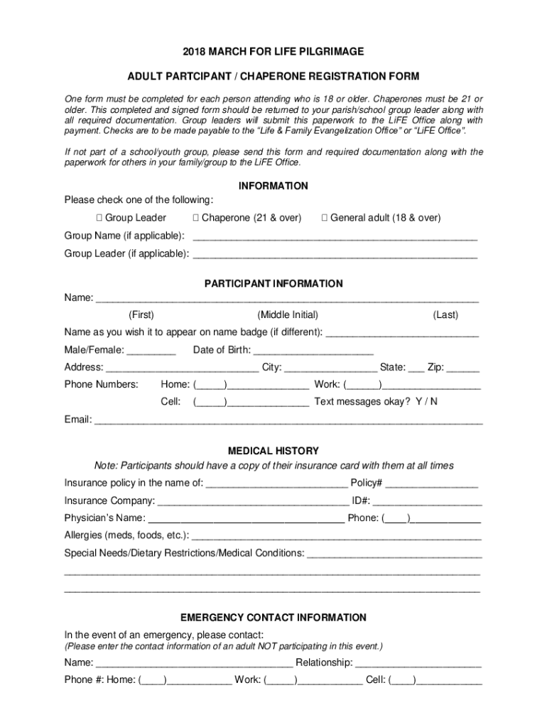 2018 MARCH FOR LIFE PILGRIMAGE ADULT PARTICIPANT / CHAPERONE REGISTRATION FORM One form must be completed for each person attending who is 18 or older. Chaperones must be 21 or older. This completed
