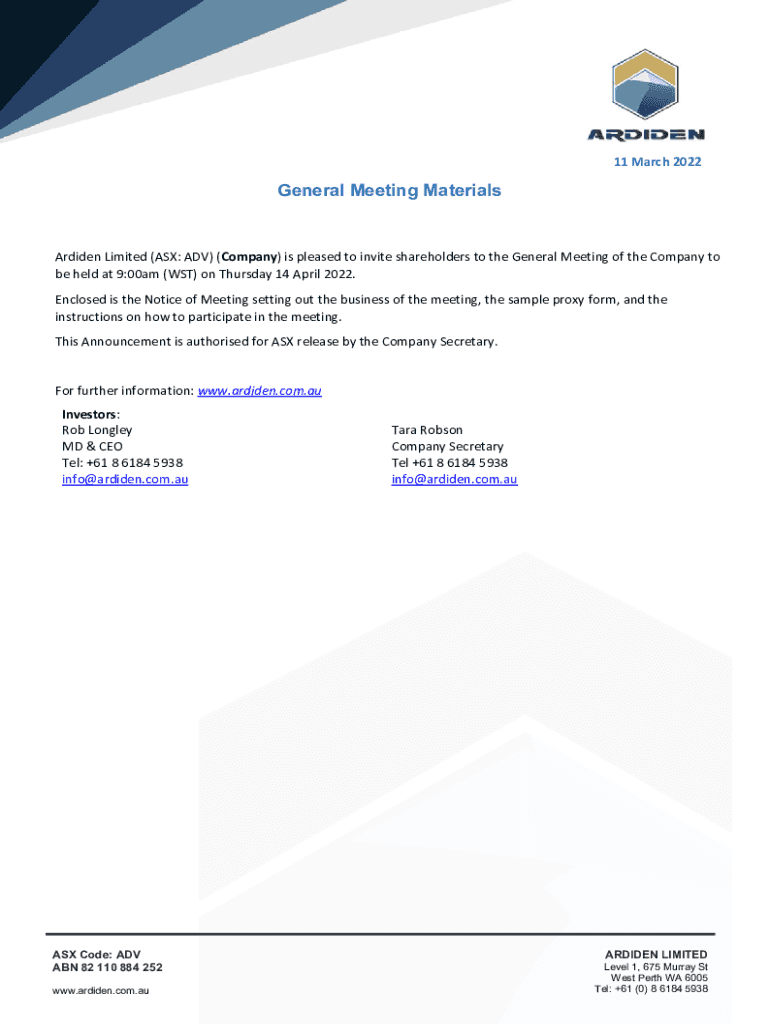 11 March 2022General Meeting MaterialsArdiden Limited (ASX: ADV) (Company) is pleased to invite shareholders to the General Meeting of the Company to be held at 9:00am (WST) on Thursday 14 April 2023.