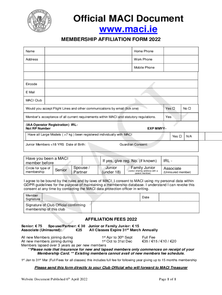 Official MAC Document www.maci.ie MEMBERSHIP AFFILIATION FORM 2022 Namesake PhoneAddressWork Phone Mobile PhoneEircode E Mail MAC Club Would you accept Flight Lines and other communications by email