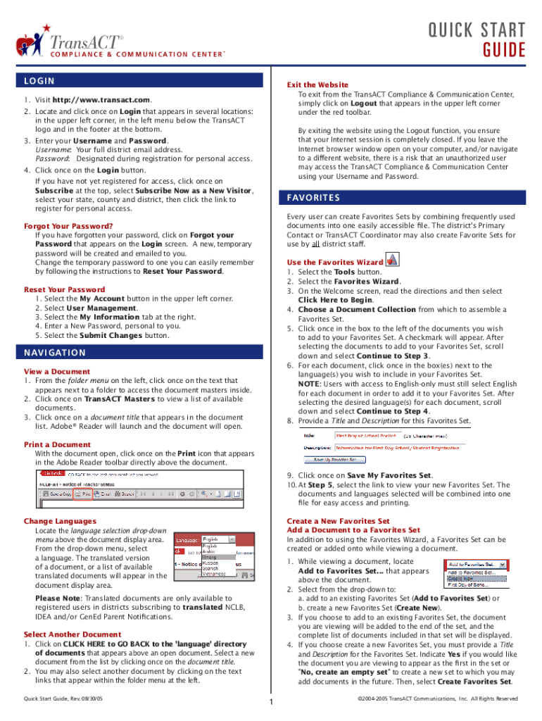 Transact TMC O M P L I A N C E & C O M M U N I C AT I O N C E N T E RQ U I C K S TA RT GUIDETMLOGINExit the Website To exit from the Transact Compliance & Communication Center, simply click on Logout