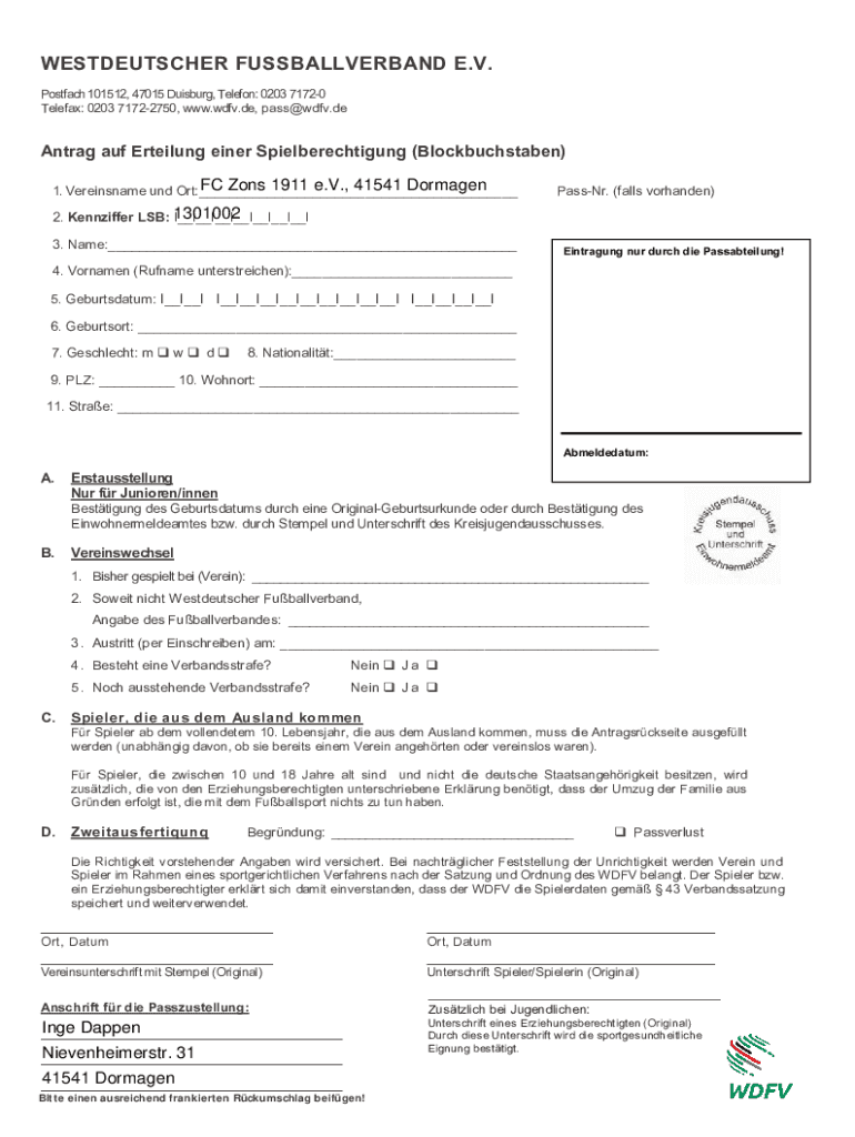. East AFC Sons 1911 e.V. Eintrittserklrung1WilhelmBuschStrasse 67, 41541 Damage Start Sons|. Surname(n)|. Stress, Hausnummer | | ..... Postnatal Cohort |. | .......... Deutsche.