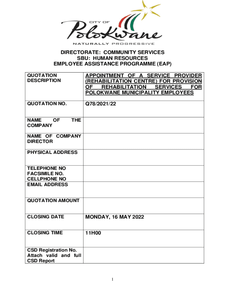 DIRECTORATE: COMMUNITY SERVICES SBS: HUMAN RESOURCES EMPLOYEE ASSISTANCE Program (EAP) QUOTATION DESCRIPTIONAPPOINTMENT OF A SERVICE PROVIDER (REHABILITATION Center) FOR PROVISION OF REHABILITATION
