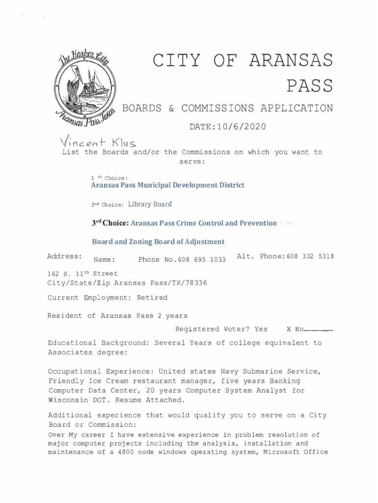 CITY OF ARKANSAS PASSWORDS & COMMISSIONS APPLICATION /i t\')CEN+DATE:10/6/2020KlusList the Boards and/or the Commissions on which you want to serve: 1st Choice:Arkansas Pass Municipal Development