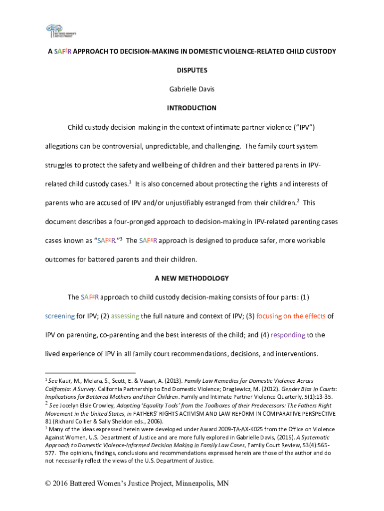 A SAFER APPROACH TO DECISION-MAKING IN DOMESTIC VIOLENCERELATED CHILD CUSTODY DISPUTES Gabrielle Davis INTRODUCTION Child custody decision-making in the context of intimate partner violence (IPA)