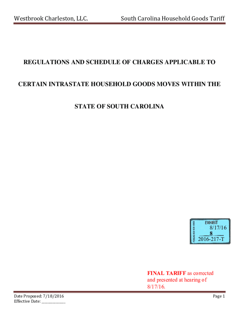 Westbrook Charleston, LLC. South Carolina Household Goods TariffREGULATIONS AND SCHEDULE OF CHARGES APPLICABLE CERTAIN INTRASTATE HOUSEHOLD GOODS MOVES WITHIN TESTATE OF SOUTH CAROLINA8/17/16 8 2016217TFINAL