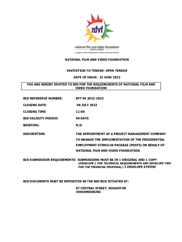 NATIONAL FILM AND VIDEO FOUNDATION INVITATION TO TENDER OPEN TENDER DATE OF ISSUE: 22 JUNE 2023 YOU ARE HEREBY INVITED TO BID FOR THE REQUIREMENTS OF NATIONAL FILM AND VIDEO FOUNDATION BID REFERENCE