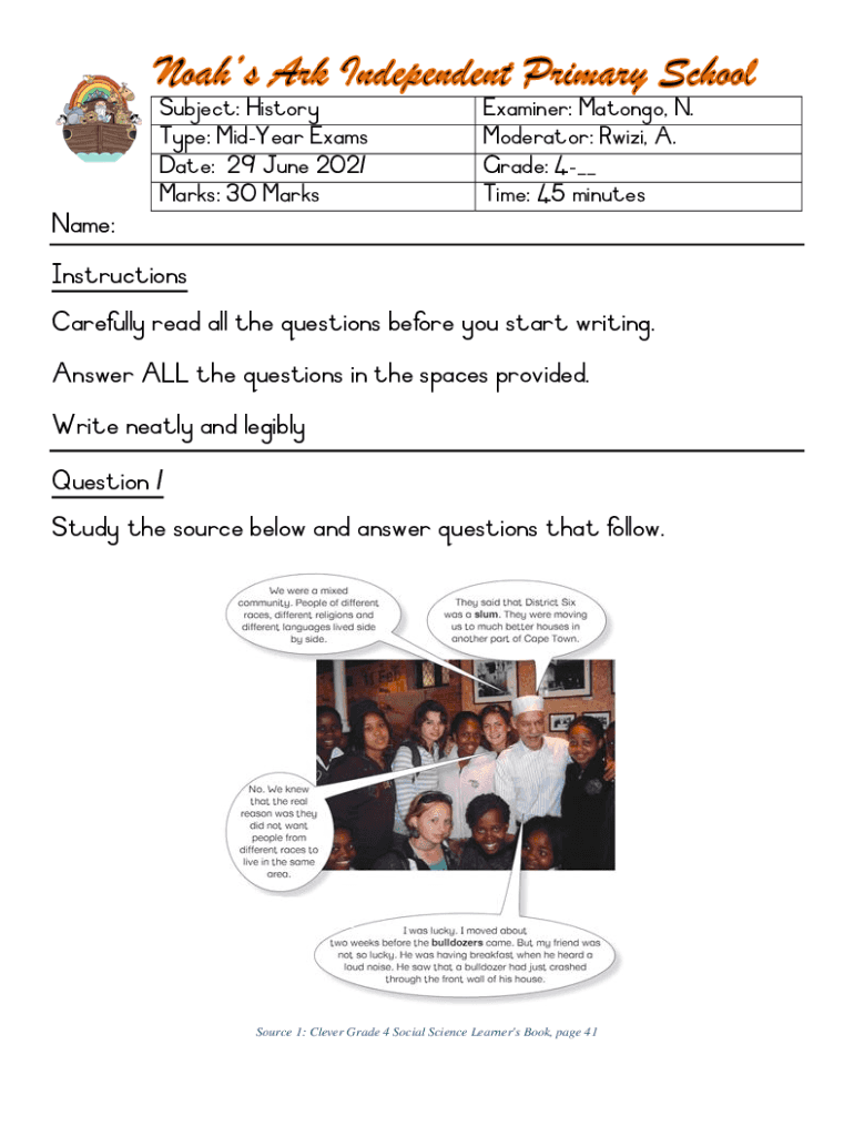 Subject: History Type: Midyear Exams Date: 29 June 2021 Marks: 30 MarksExaminer: Mating, N. Moderator: WWII, A. Grade: 4__ Time: 45 minutesName: Instructions Carefully read all the questions before
