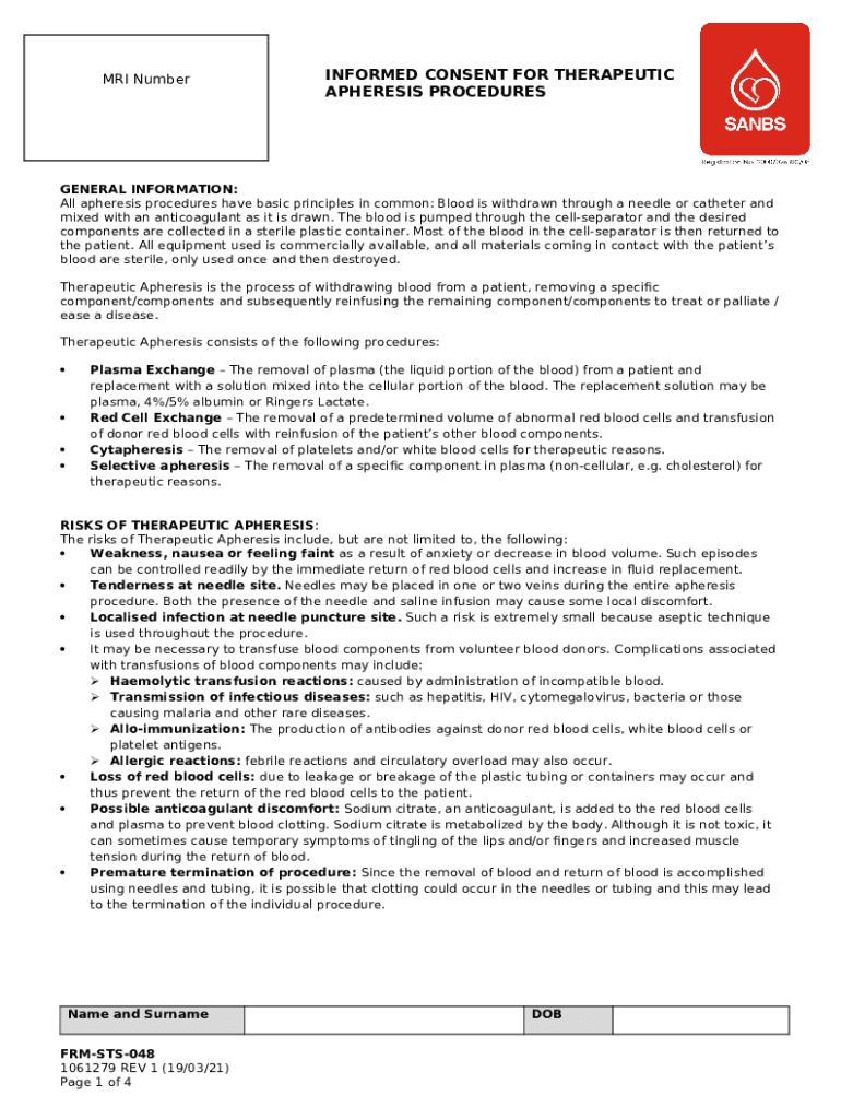 What is National 111F00602 Therapeutic Apheresis Consent - sanbs org Form?