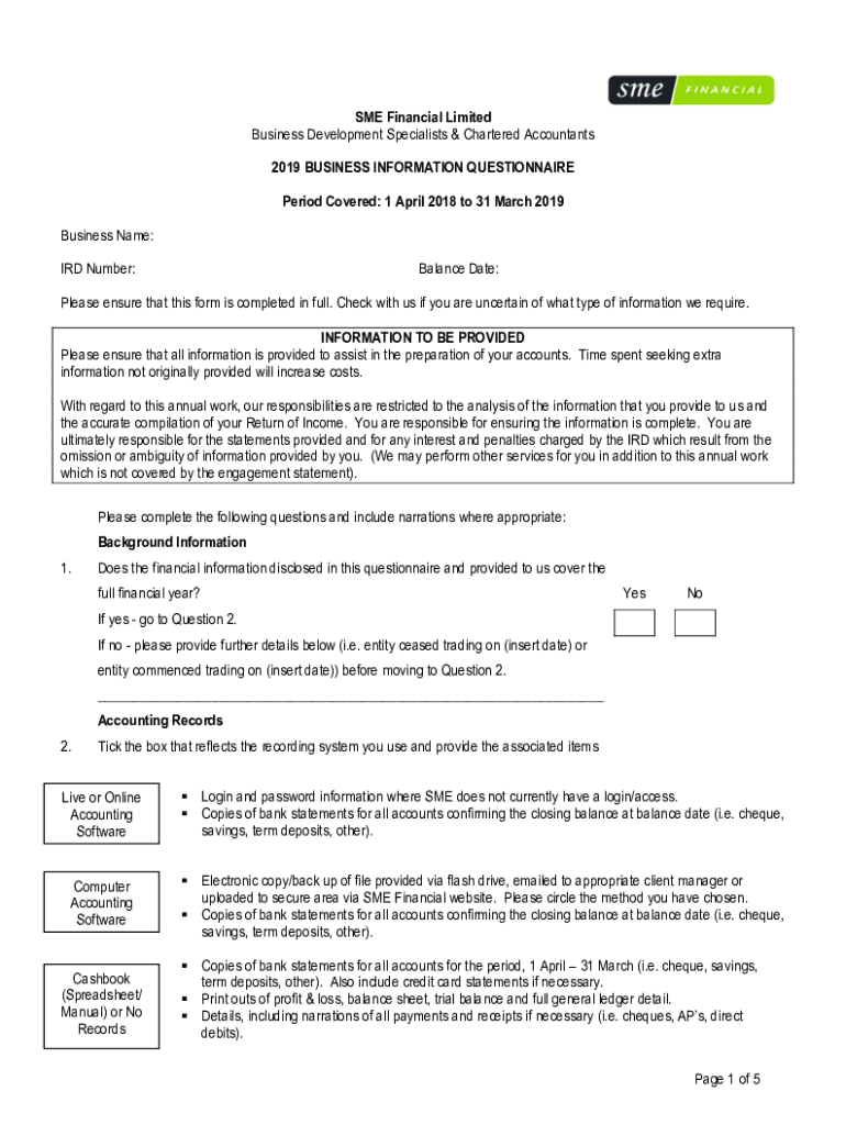 SME Financial Limited Business Development Specialists & Chartered Accountants 2019 BUSINESS INFORMATION QUESTIONNAIRE Period Covered: 1 April 2018 to 31 March 2019 Business Name: IRD Number:Balance