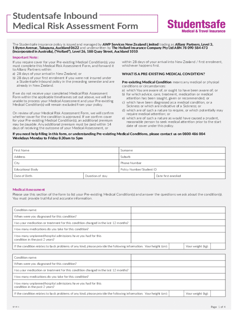 Student safe Inbound Medical Risk Assessment Form The Student safe insurance policy is issued and managed by AWP Services New Zealand Limited trading as Allianz Partners, Level 3, 1 Byron Avenue,