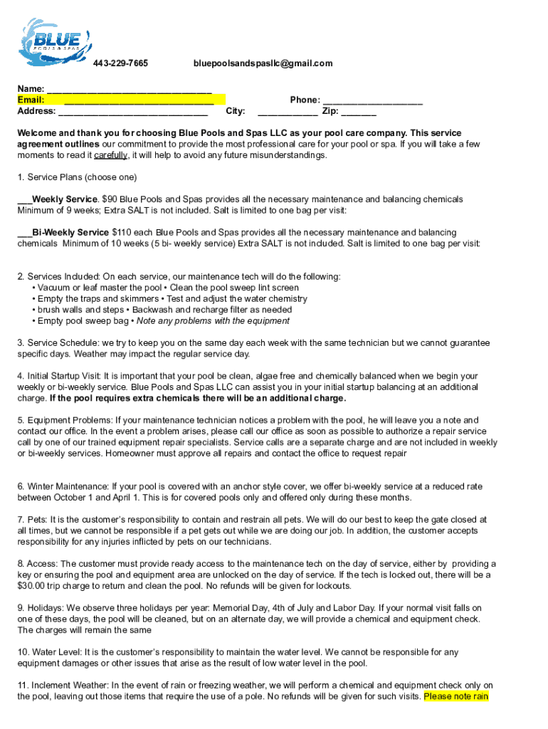 4432297665bluepoolsandspasllc@gmail.comName: ___ Email: ___ Address: ___City:Phone: ___ ___ Zip: ___Welcome and thank you for choosing Blue Pools and Spas LLC as your pool care company. This service