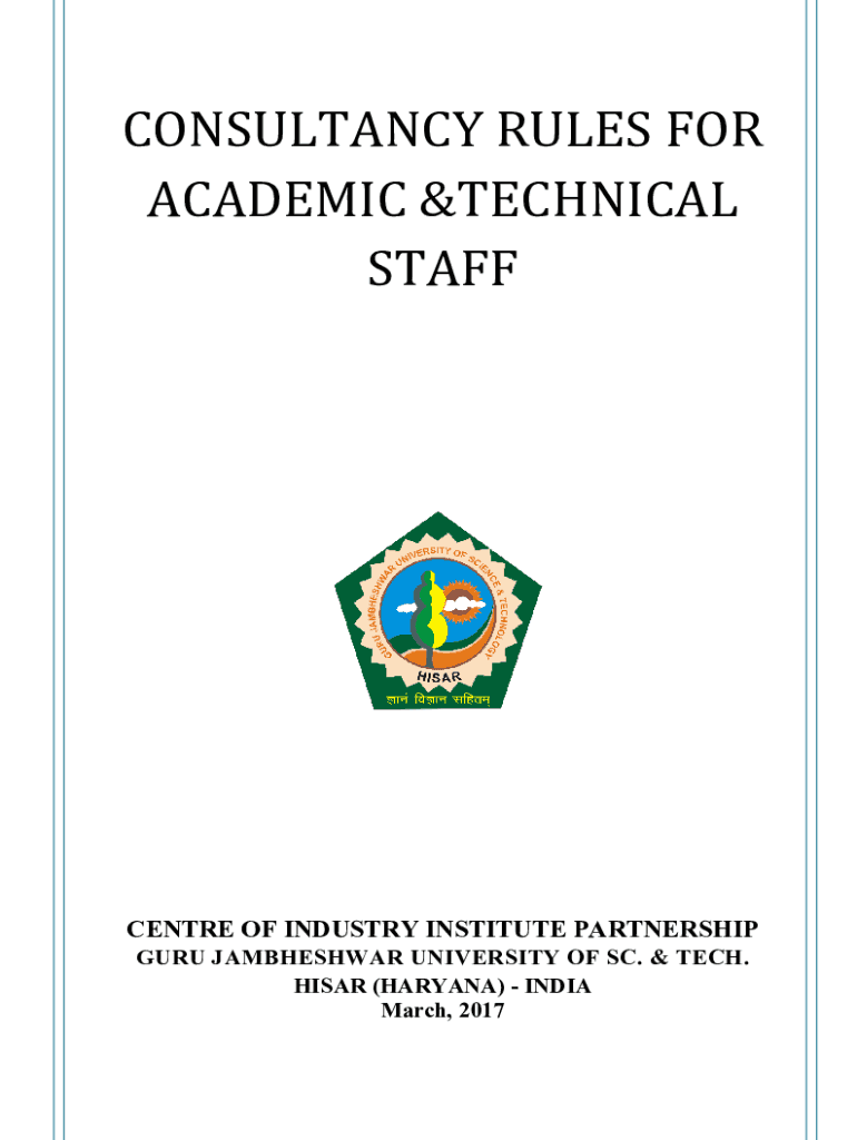 CONSULTANCY RULES NONACADEMIC &TECHNICALSTAFFCENTRE OF INDUSTRY INSTITUTE PARTNERSHIP GURU JAMBHESHWAR UNIVERSITY OF SC. & TECH. HI SAR (HARYANA) INDIA March, 2017CONSULTANCY RULES FOR THE ACADEMIC