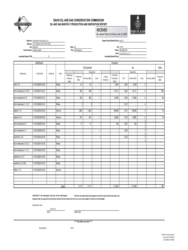 IDAHO OIL AND GAS CONSERVATION COMMISSION AND GAS MONTHLY PRODUCTION AND DISPOSITION REPORT By James Them at 3:54 pm, Jan 14, 2023 Operator: Address: City: Contact Name:Snake River Oil and Gas, LLC