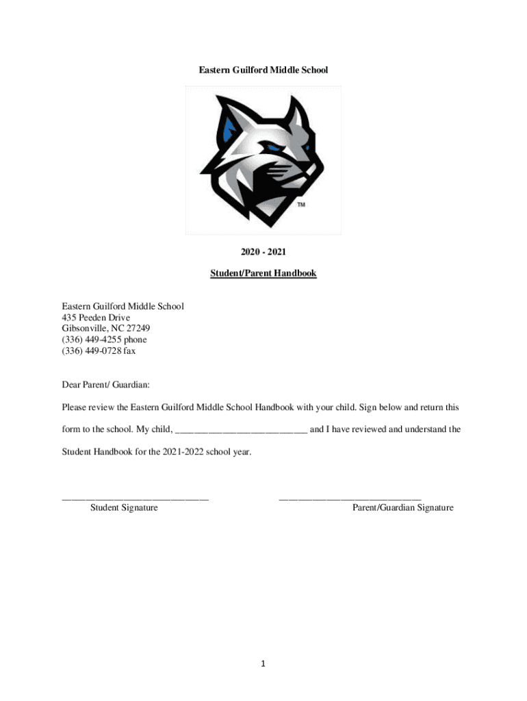 Eastern Guilford Middle School2020 2021 Student/Parent Handbook Eastern Guilford Middle School 435 Pee den Drive Wilsonville, NC 27249 (336) 4494255 phone (336) 4490728 fanfare Parent/ Guardian: Please