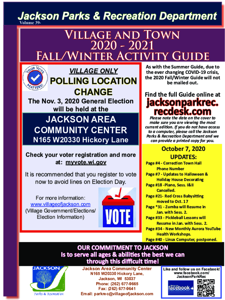 Jackson Parks & Recreation Department Volume 39Village and Town 2020 2021 Fall/Winter Activity Guide VILLAGE ONLYPOLLING LOCATION Change Nov. 3, 2020 General Election will be held at Jackson AREA