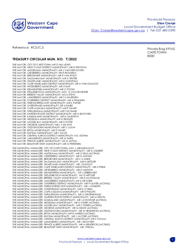 Provincial Treasury Dan Crone Local Government Budget Office Dan. Cronje@westerncape.gov.za | Tel: 021 483 0390Reference: RCS/C.5TREASURY CIRCULAR MUN. NO. 7/2022Private Bag X9165 CAPE TOWN 8000THE