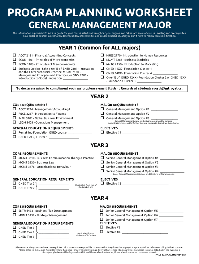 PROGRAM PLANNING WORKSHEET GENERAL MANAGEMENT MAJOR This information is provided to act as a guide for your course selection throughout your degree, and takes into account course levelling and prerequisites.